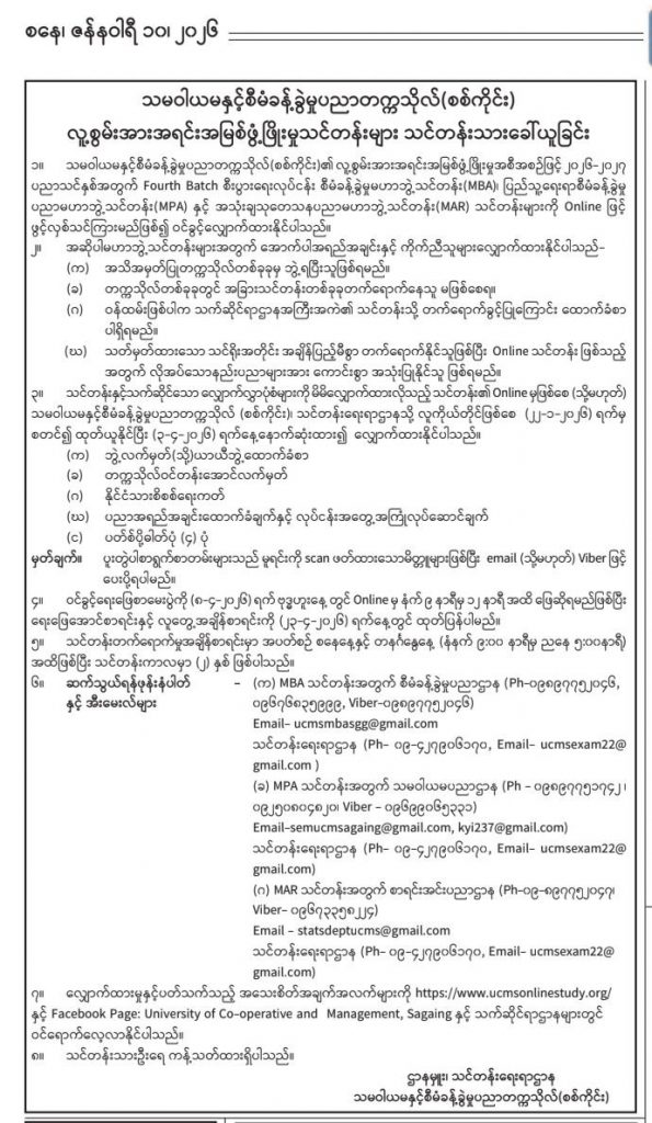 Uncategorized ၂၀၂၆-၂၀၂၇ ပညာသင်နှစ် လူ့စွမ်းအားအရင်းအမြစ်ဖွံ့ဖြိုးမှုသင်တန်း Fourth Batch အတွက် MPA, MBA, MAR online သင်တန်းသားများခေါ်ယူခြင်း By UCMS Admin On January 10, 2026January 10, 2026